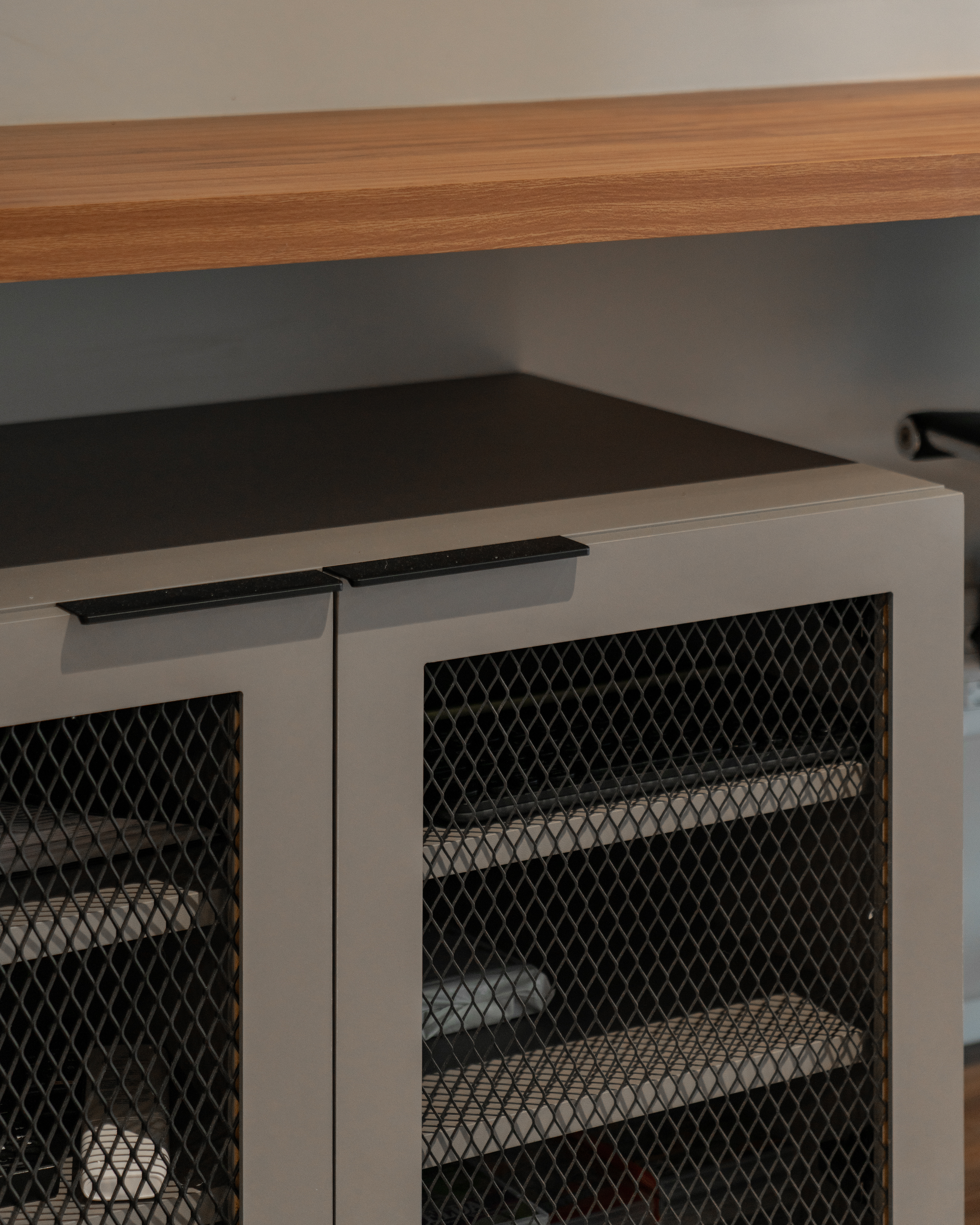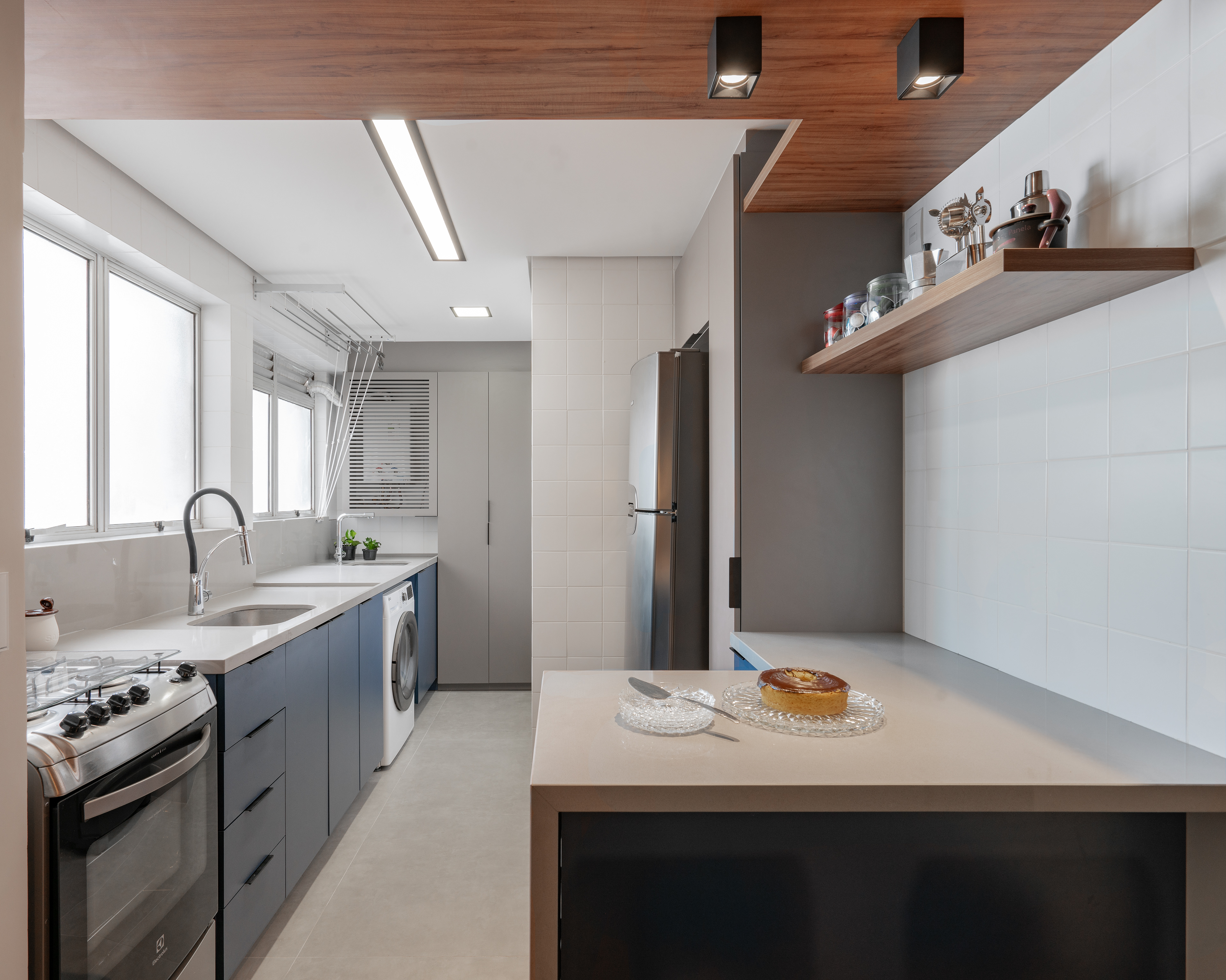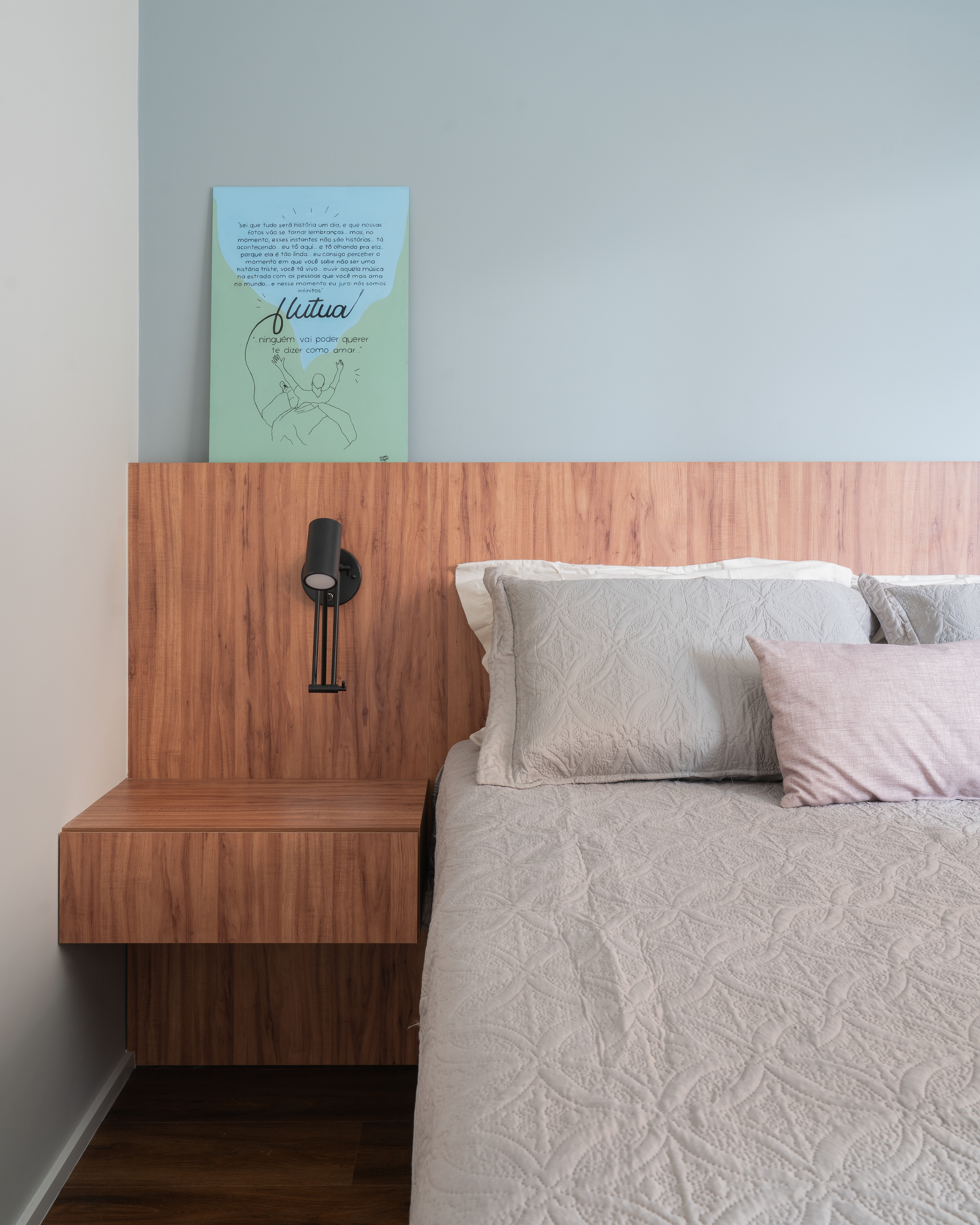 Projeto para o apartamento de um jovem que desejava um lar funcional e prático. Apostamos em acabamentos modernos, como madeira média, cinza e preto, combinados com pontos de cor em azul e verde para criar um ambiente contemporâneo e cheio de personalidade.