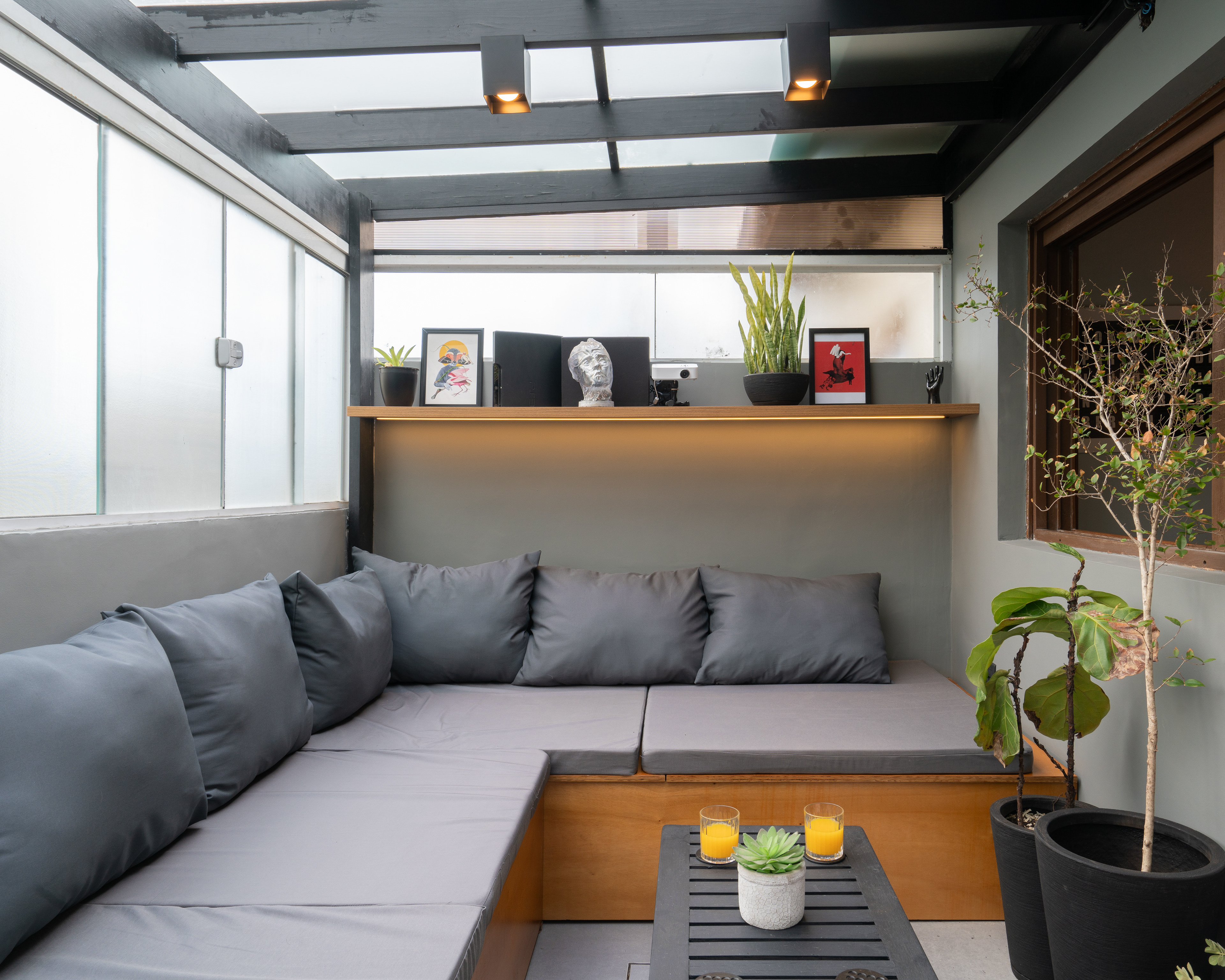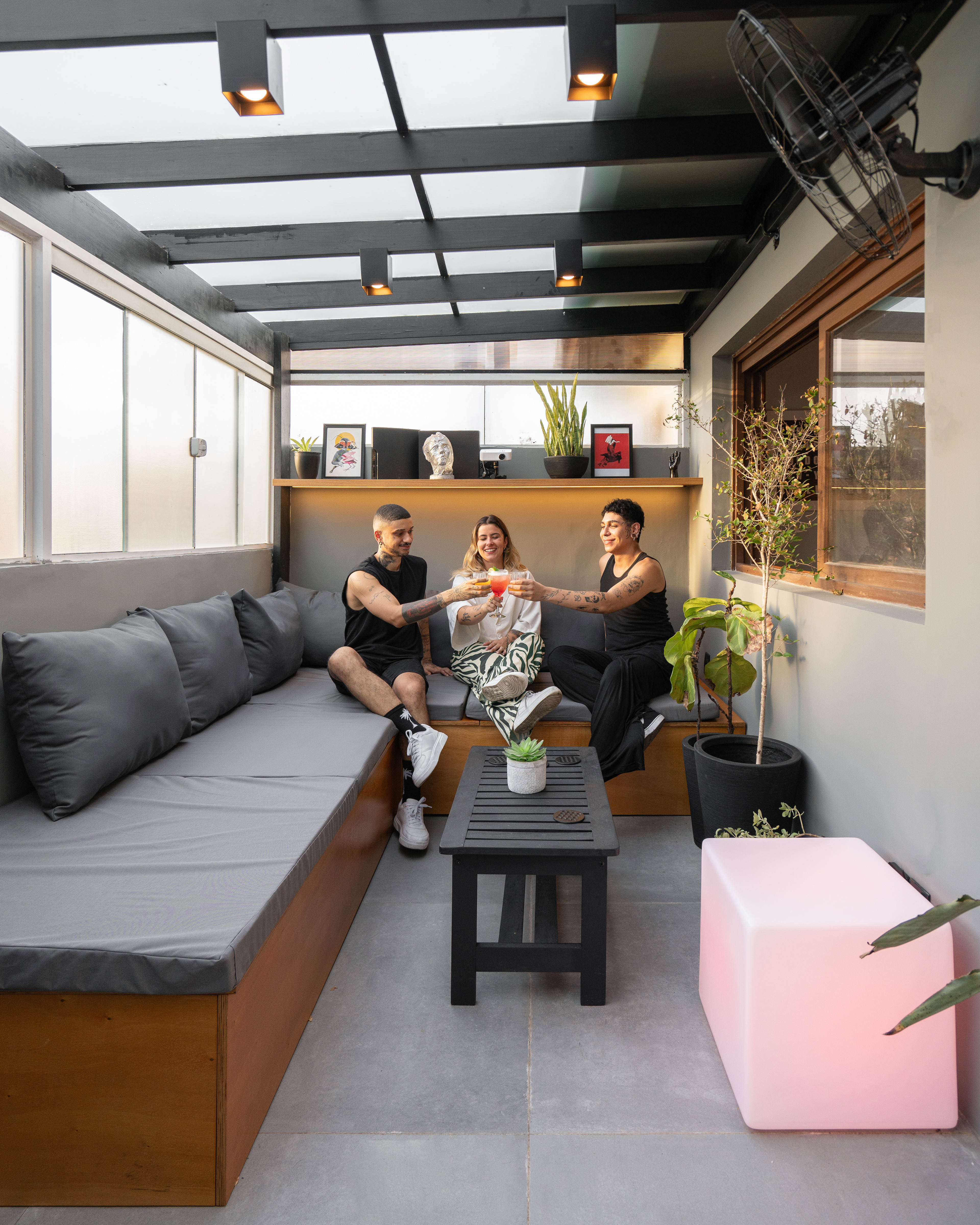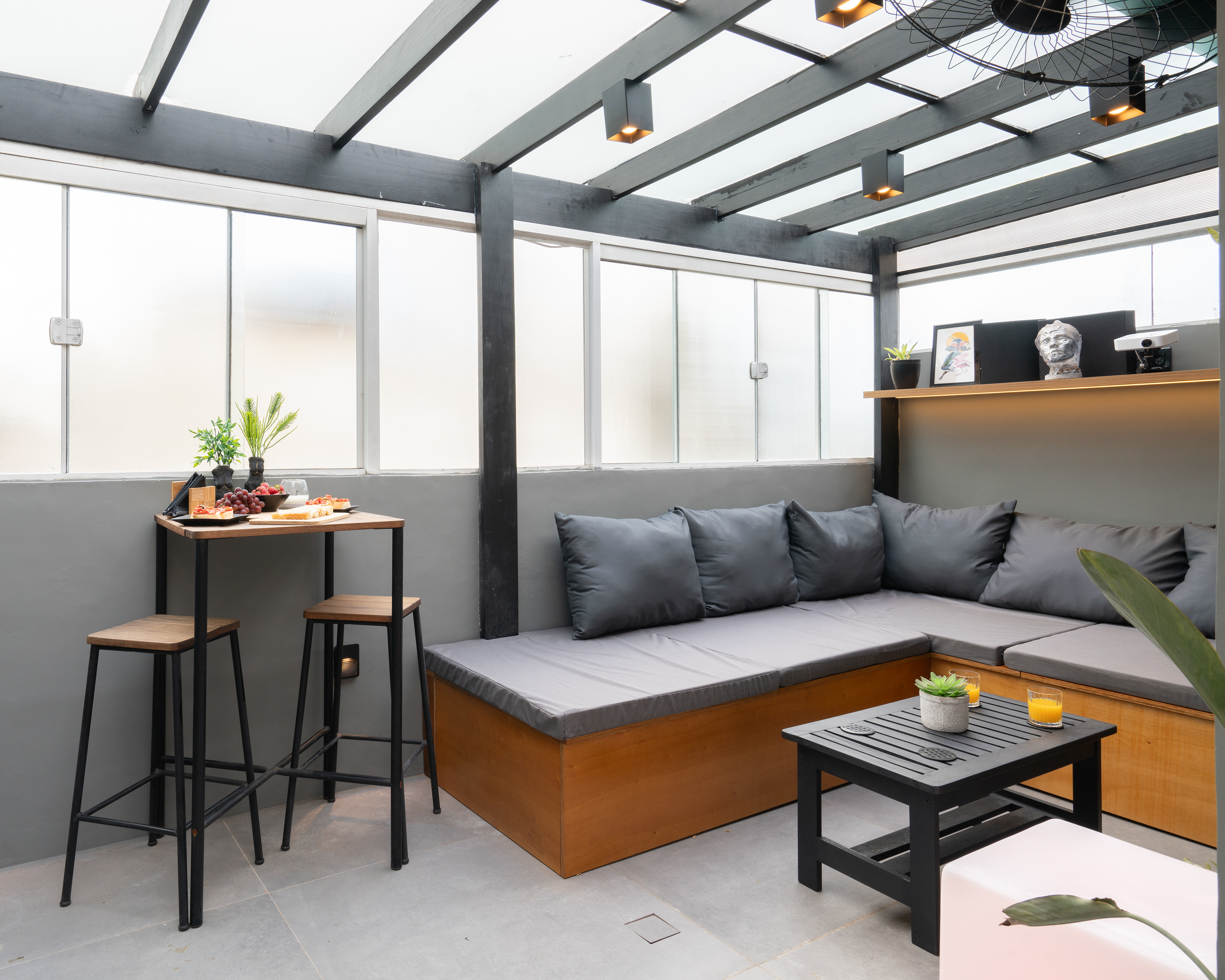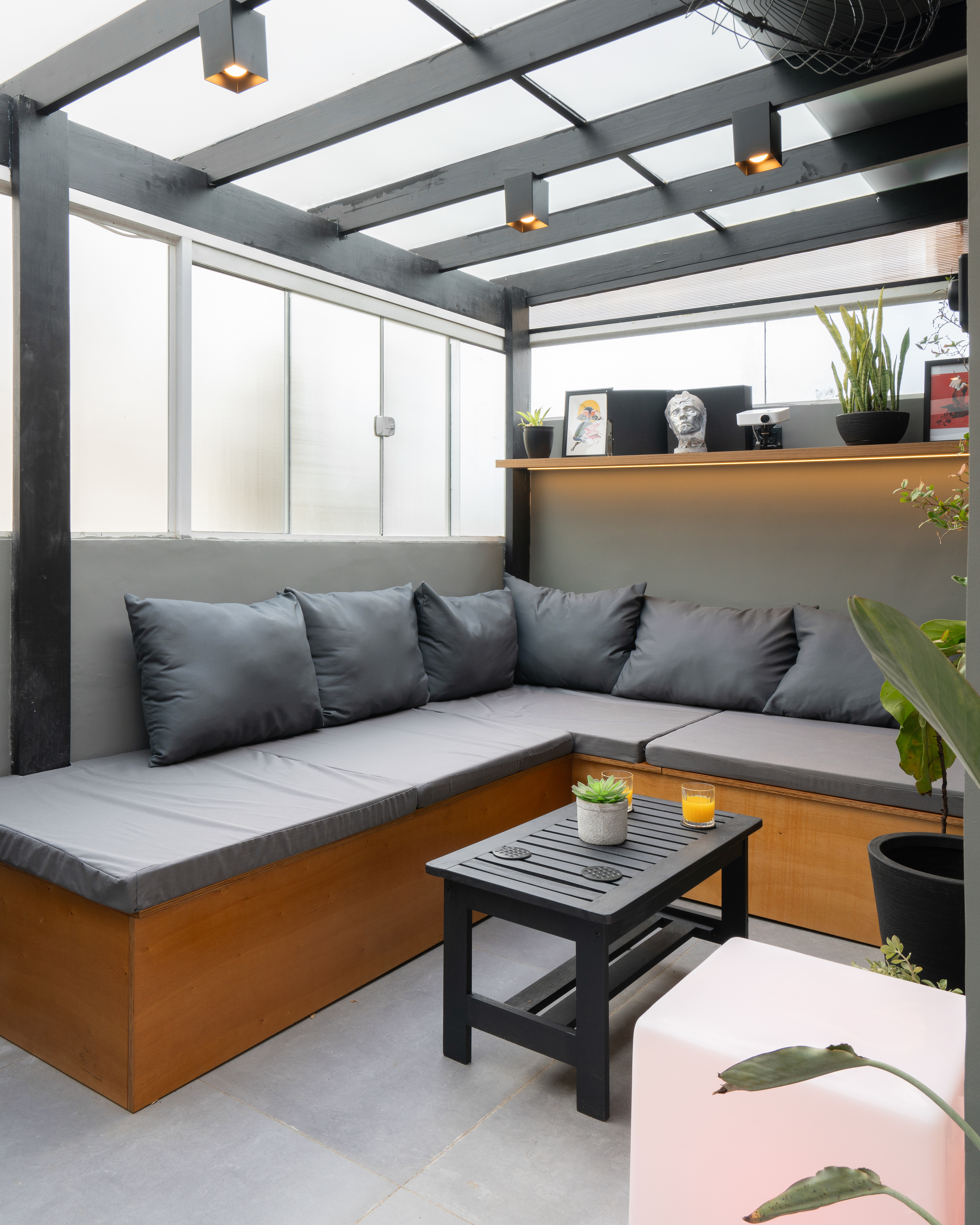 Projeto para área externa de cobertura de um apartamento de um jovem casal. A ideia principal era transformar o espaço para eles receberem os amigos e também curtir e relaxar.